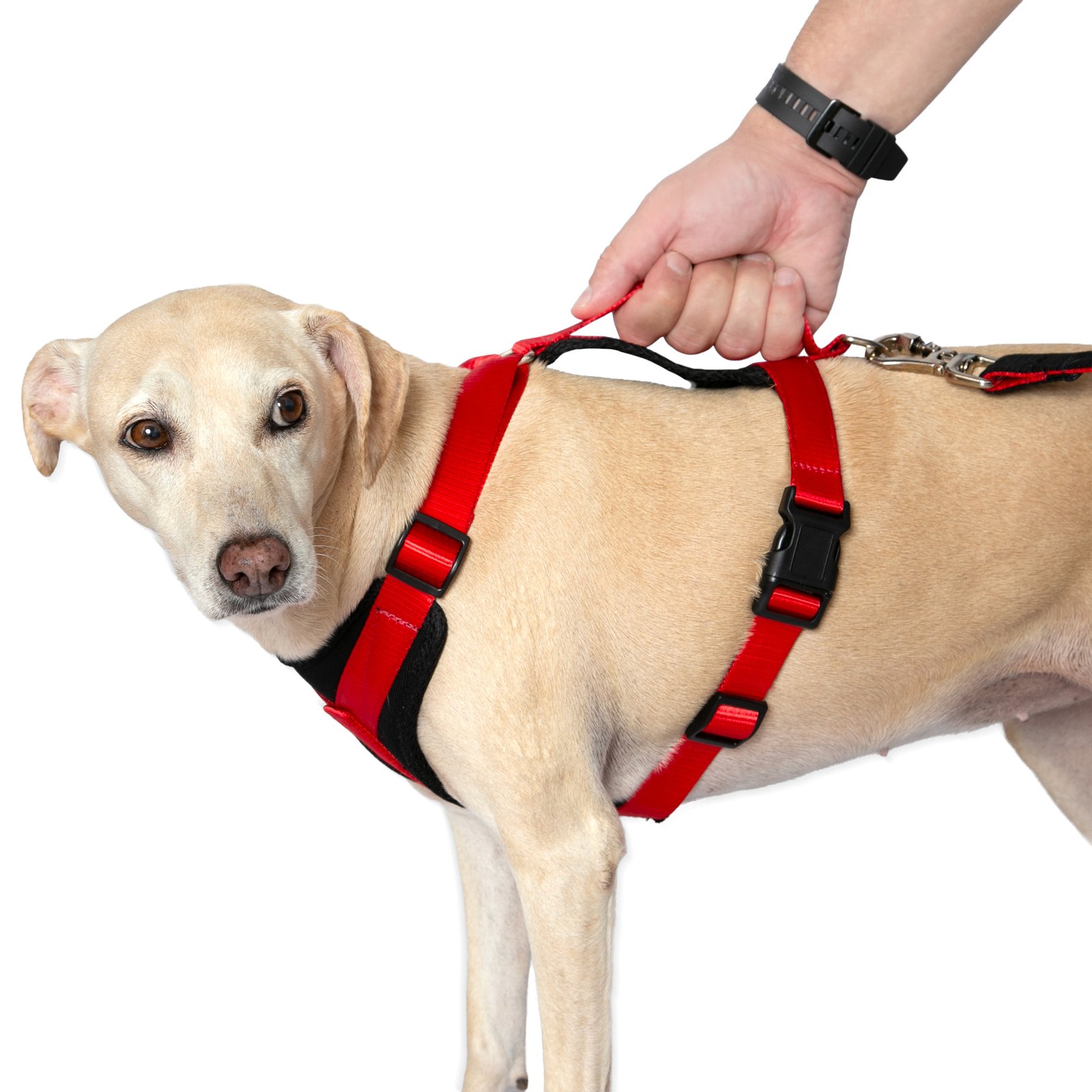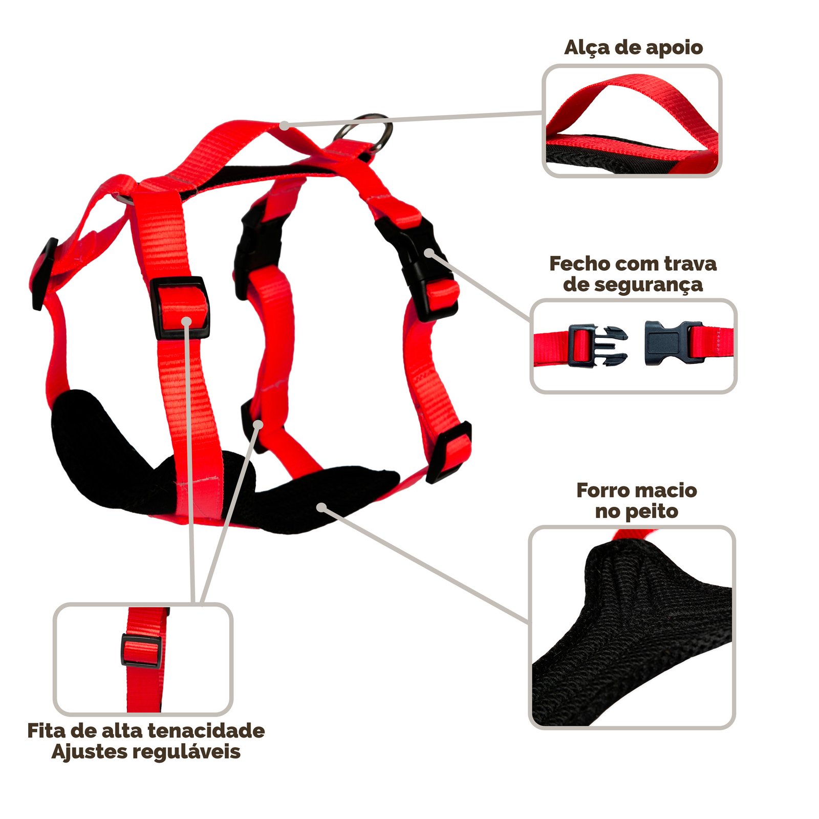 Sua construção em fitas traz um visual mais limpo e funcional, enquanto a alça de apoio oferece mais controle em momentos que exigem contenção rápida, como saídas de elevador, cruzamento com outros cães ou situações de maior agitação.